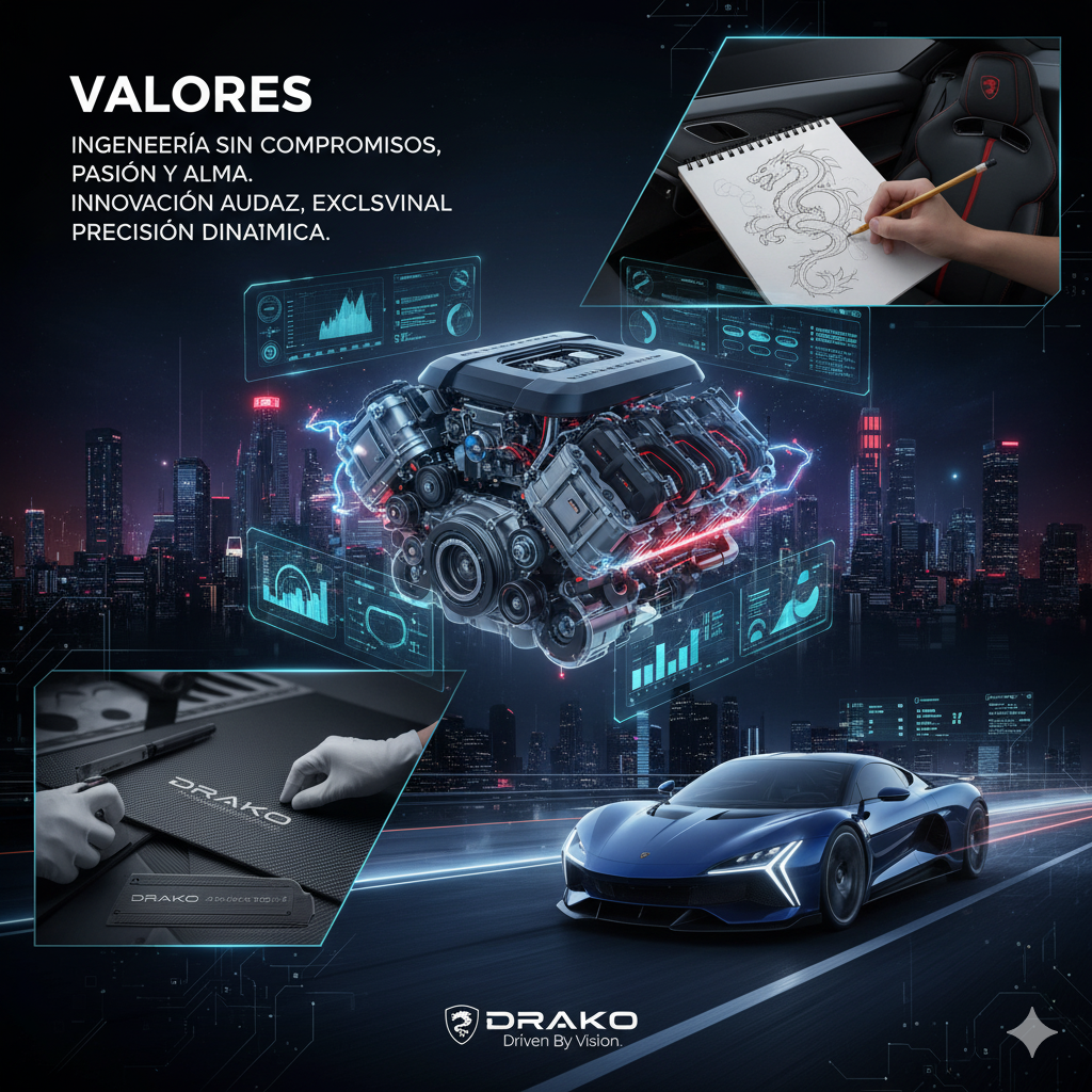 La visión de DRAKO es ser reconocida como la marca de superdeportivos más innovadora y emocionalmente conectada del mundo. Aspiramos a ser los pioneros que demuestran que el pináculo de la potencia de combustión, representado por el motor W16, no solo puede coexistir con la electrificación, sino que puede ser potenciado por ella para alcanzar niveles de rendimiento y control nunca antes vistos, estableciendo un nuevo estándar de lujo, exclusividad y respeto por la tradición de la ingeniería artesanal.